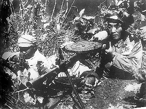 就在各級(jí)指揮員心急如焚地等待戰(zhàn)況匯報(bào)時(shí),戰(zhàn)斗一幕比一幕慘烈地在兩個(gè)高地展開——機(jī)槍射臺(tái)被炸爛了,戰(zhàn)士陳治國(guó)用負(fù)傷的身體充當(dāng)射臺(tái)。孫子明4次負(fù)傷昏了過(guò)去,醒來(lái)時(shí)敵人已經(jīng)沖上了陣地,他握著3顆手榴彈沖入敵群……