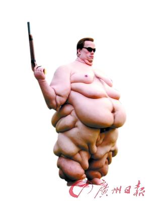 一座220厘米高、以美國明星施瓦辛格為原型創(chuàng)作的“肥胖”雕塑,近日起在錦漢展覽中心首屆“藝術廣東”上展出。其夸張而荒誕的手法呈現(xiàn)出一種詭異的表現(xiàn)力。這是藝術家舒勇于2006年至2008年創(chuàng)作的硅膠雕塑,他表示其創(chuàng)作背景來自因美國爆發(fā)的金融危機而引發(fā)的全球金融海嘯。