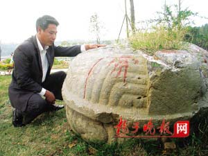 記者看到,這尊“赑屃”石刻沒有頭,根據(jù)風(fēng)化程度推測,頭部大約是在100年前脫落的,身上馱的墓碑也不見了,原來插碑的地方雜草叢生,倒是滿身的形似龜殼的立體花紋細(xì)膩清晰,經(jīng)歷了600多年的歲月,原來裸露在地面的上面10厘米部分呈黑色,下面灰色的部分是常年被埋在土里的。有趣的是,“赑屃”身上有許多紅色油漆,乍一看很像是它流的血。中山陵園管理局文物處專家路侃介紹,這是石頭風(fēng)化過程中油漆滲透到里面,造成了這種效果。
