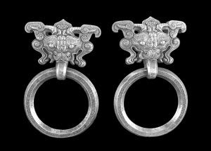 這對門環(huán)為純銀澆鑄,是清朝乾隆時(shí)期皇家造辦處專為圓明園中的建筑特制的門環(huán),樣子仿西周的饕餮銅環(huán),不同于當(dāng)時(shí)常見的獅首或古釘狀式樣,十分罕見。