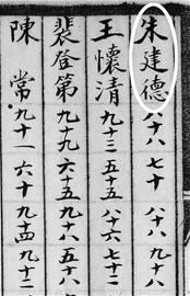 在 《四川省城高等學(xué)堂體育學(xué)堂甲乙兩班學(xué)生積分表》上,記者找到了朱德的學(xué)習(xí)成績記錄,不過成績單上使用的名字是朱建德。這份成績單共列出了朱德修身、國文、教育、心理、生理、兵學(xué)、器械等13門學(xué)科的成績,其中器械課的成績最好,達(dá)到滿分一百,心理課成績也有98分。全班52人中,朱德的總成績位居第10名。