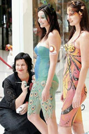 昨日,Ambah早上8時便開始在兩名外籍模特兒身上畫彩繪,在助手的協(xié)助下,模特兒在下午1時便化身成亮麗的孔雀和蝴蝶。她說,最少要用4小時,若要將每一部分都細(xì)致地繪畫出來,便可能要畫上一整天。由于模特兒需要休息和洗澡,所以每幅作品通常只能保持一天,但她并不覺得太可惜,反而這種一瞬間的美麗,更能給吸引她去創(chuàng)作。