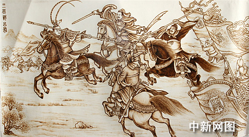 為避免干擾,王國棟把工作室設(shè)在女兒家樓房的地下室里。一塊案板,一盞臺燈,一把電烙鐵,一副老花鏡,幾本參考書,就是他創(chuàng)作的全部家當(dāng)。每天早5點起床,晚11點休息,他把全部心思都花在了烙畫上。熟讀原著,找懂三國的朋友切磋,確定故事題目,反復(fù)修改,定稿,烙繪,又是一年輪回,老王的100米長卷81個故事圖譜也出來了。為了使畫面線條更加流暢,他苦心鉆研,改革了烙鐵的銅筆頭。為了增強(qiáng)表現(xiàn)力,他嘗試著在烙畫中添加輔料來增強(qiáng)表現(xiàn)力。這些,都使《三國演義》的繪制技巧和藝術(shù)創(chuàng)作又達(dá)到了一個嶄新的高度。