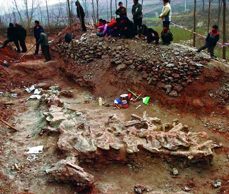 發(fā)掘現(xiàn)場位于郝嶺村東頭的一條小土溝的北側(cè)半坡上,距離現(xiàn)場北側(cè)20米處就是當?shù)卮迕竦脑郝洹T诂F(xiàn)場記者看到,這是一個相對規(guī)則的發(fā)掘坑,坑深約1米,紅褐色的恐龍背椎和頸椎骨骼形狀很清晰,遠遠望去,可以看出這條恐龍頭頸向東、身子朝西南方向呈平臥狀。