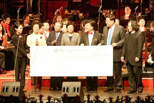 全場(chǎng)的最高潮無疑是3家主辦方?jīng)Q定將門票收入所得共103.9720萬元票款的支票交到中華慈善總會(huì)代表的手中,委托其捐獻(xiàn)給受雨雪災(zāi)害最嚴(yán)重的湖南、貴州、廣西等省區(qū)市時(shí),觀看演出的觀眾紛紛起立,掌聲如雷鳴般鼓動(dòng)。