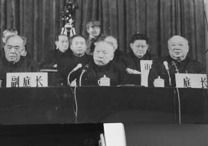 1980年伍修權(quán)(前排中)在法庭上穿著制服審判時的情景。
