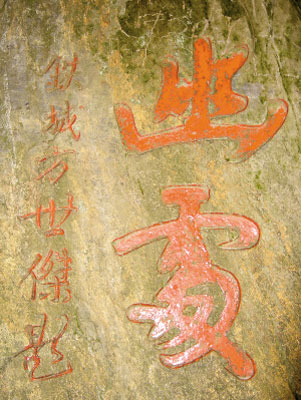 隨后,記者來到鼎湖山,在上慶云寺的山路上,如愿找到了“曲徑通幽處”幾個題刻碑石。但只有“幽處”的碑石上清晰地題寫著“鐵城方世杰”(見上圖)。