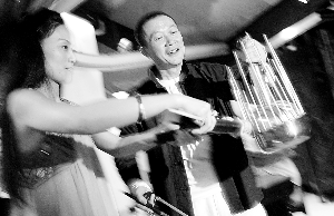 發(fā)布會上,譚盾和《茶》表演者一起演示了用紙吹奏出音符,還用紙鼓打擊出了獨特的節(jié)奏!∮浾 郭延冰 攝