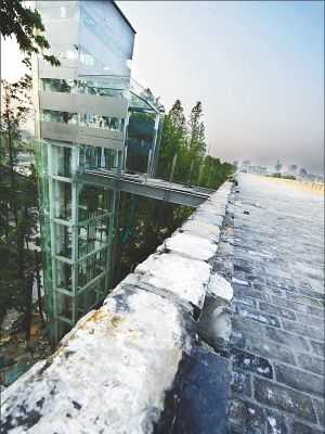 “前幾天這里已經(jīng)建好了一個(gè)圓柱形的電梯井,井壁是綠色透明的玻璃,聽(tīng)當(dāng)時(shí)正在施工的工作人員說(shuō),這里要建一個(gè)觀光直達(dá)電梯!奔易∥涠ㄩT附近的一位南京市民董先生當(dāng)時(shí)對(duì)早報(bào)記者表示,明城墻已經(jīng)進(jìn)入世界物質(zhì)文化遺產(chǎn)預(yù)備名單,與國(guó)內(nèi)其他幾個(gè)城市的明城墻捆綁申遺,“如果在這兒建一個(gè)現(xiàn)代化的電梯,這樣的古城墻還能申遺成功嗎?”