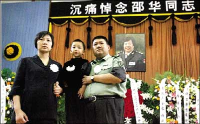 毛新宇身著軍裝,他的妻子劉濱和孩子都穿著深色的衣服,胸前戴著白花,胳膊上佩戴黑紗。每每有人前來吊唁,他們都一一上去握手,邵華生前的老朋友都不停地安慰毛新宇和劉濱。