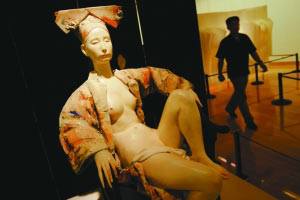 昨日,在第三屆中國北京國際美術(shù)雙年展上,一尊私處遮著白方巾的半裸慈禧雕塑,引起不少觀眾注意。雕塑作者李象群稱,該雕塑本無此“遮羞布”,是主辦方稱有觀眾舉報,才將雕塑私處遮蓋。