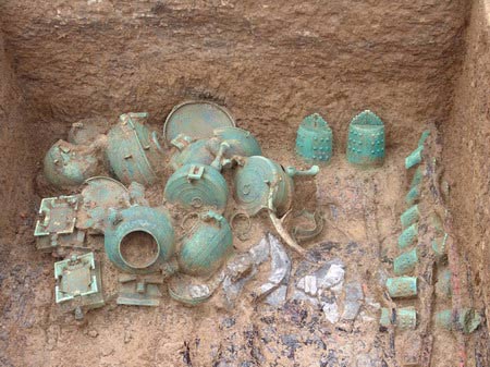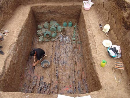 據(jù)介紹,一號墓在發(fā)掘過程中,發(fā)現(xiàn)槨室上部有陪葬棺和3名殉葬人的骨架痕跡,以及玉器、銅器等10多件。殉人的出現(xiàn),說明一號墓墓主人身份高貴。而該墓出土5座銅鼎也說明墓主人身份在大夫一級(據(jù)記載,古代禮制規(guī)定,天子9鼎、諸侯7鼎、大夫5鼎、元士3鼎或1鼎)。