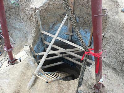 昨天下午,早報(bào)記者來(lái)到考古現(xiàn)場(chǎng),看到一個(gè)小型起吊機(jī)已深入“井內(nèi)”。據(jù)介紹,圓形的地宮如同一口深井,直徑2.2米,在圓井的正中間,還發(fā)現(xiàn)四塊石板拼起的方框,未見滲水,放有一層銅錢。華國(guó)榮表示,結(jié)構(gòu)和內(nèi)容正在逐步認(rèn)識(shí)過程中。
