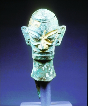 四川廣漢三星堆是中國西南地區(qū)一處分布范圍最大、延續(xù)時間最長、文化內(nèi)涵最為豐富的古城、古國、古蜀文化遺址。它因1986年兩座大型祭祀坑的發(fā)掘而聞名于世,被評為20世紀(jì)中國最重大的考古發(fā)現(xiàn)之一。這一遺址的年代據(jù)考證在商代中晚期前后,距今約3200至3300年前,共出土金、銅、玉、石、骨器等重要文物1800余件。其中,頗具代表性且造型獨(dú)特的青銅縱目面具被認(rèn)為是人與神的復(fù)合體,是古蜀先民頂禮膜拜的偶像。此次展覽中的戴金面罩青銅人頭像、銅跪坐人像、銅太陽形器、銅眼形器、玉戈、玉璋等,都頗具精絕大雅的造型和瑰奇神秘的風(fēng)格,從各個側(cè)面為人們勾勒出一個光怪陸離無限精彩的古蜀社會。