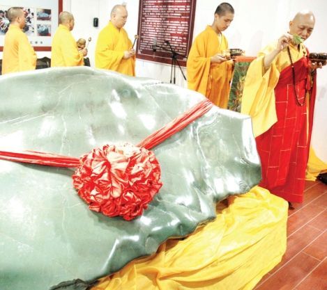 昨日,歸元禪寺為重達(dá)3.2噸、價值億元的和田玉舉行了開光儀式。即日起這塊玉石正式向社會開放展示,同時向社會征集最佳供奉方案。