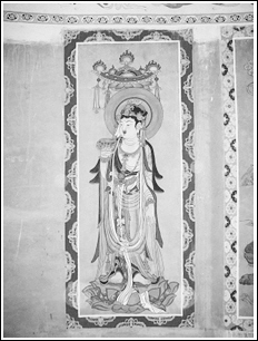常嘉煌介紹,被盜的《藥師菩薩像》圖源自1907年法國人伯希和盜走的敦煌藏經(jīng)洞唐代絹畫,由李承仙先生復(fù)原放大繪制,壁畫高210厘米,寬80厘米。這是敦煌現(xiàn)代石窟的第一幅壁畫,也是李承仙生前留給敦煌的最后遺作。這幅壁畫是在裱糊在洞窟墻壁上的絲絹上完成的,被盜時被整體揭下。