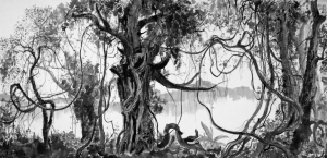 觸動(dòng)吳冠中創(chuàng)作此畫的是蘇州郊外司徒廟的四株漢柏。它們?cè)饫着,后又?fù)蘇,從斷干折枝中再發(fā)新芽,于是再生枝藤。乾隆皇帝曾以“清”、“奇”、“古”、“怪”分別命名。