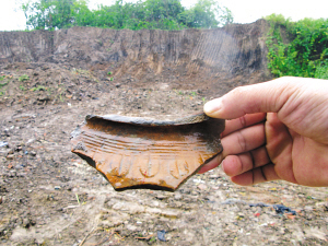 聞訊趕來的南京市博物館考古隊(duì)員在挖塌的斷壁泥土中隨便撥弄,就找到幾塊碎陶片!澳憧,這塊是黑陶、這塊是夾砂紅陶,從陶片看,這個(gè)器皿不小,上面還有不是很規(guī)則的戳印紋!庇浾咦屑(xì)一看,上面刻的紋飾非常精美。一位考古專家說,此次經(jīng)過考古勘探,郭家山坑商周時(shí)期古文化遺址長220米,寬120米左右,面積達(dá)到2.3萬平方米。從斷面上可見大量紅燒土層及紅陶、灰陶片,其中可辨器有罐、鬲、鼎等。據(jù)悉,考古人員在這個(gè)文化遺址上一共探測到了8個(gè)文化層,最底層則是3000多年前的商周文化層。