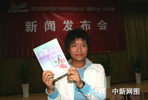 中新網(wǎng)揚(yáng)州10月17日電(記者崔佳明)10月17日下午,江蘇省揚(yáng)州市邗江實(shí)驗(yàn)學(xué)校舉行新聞發(fā)布會,宣布該校初三學(xué)生趙千迪的十八萬字長篇小說《魔界少女》第一季終于于今年二月創(chuàng)作完成,并于八月份由中國戲劇出版社正式出版發(fā)行。揚(yáng)州市作家協(xié)會主席正式宣布,吸收趙千迪入會,成為該市年齡最小的作家。