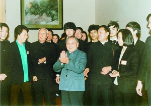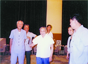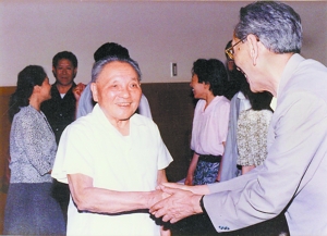 手忙腳亂的我,慌忙地按了兩下快門兒,一下閃光燈未亮,一下卻較好地拍下了小平、萬里同志與大家在一起的照片,并于次日見報(bào)。(圖一)