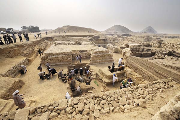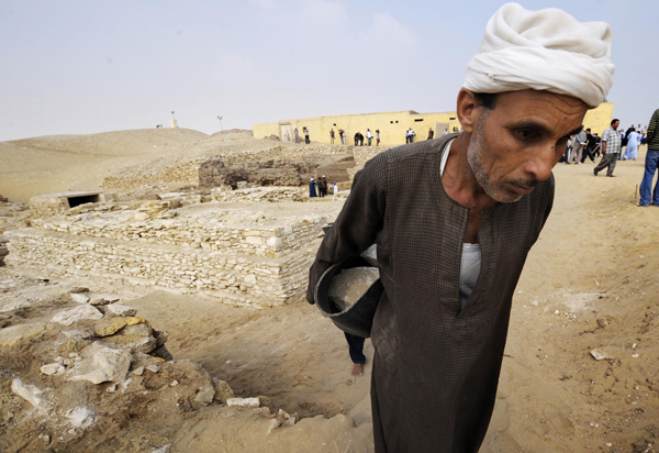11月11日,埃及考古人員在新發(fā)現(xiàn)的金字塔周圍工作。