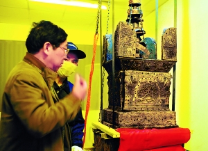 昨天下午3時(shí)28分,南京市博物館和晨光集團(tuán)的專(zhuān)家成功地將長(zhǎng)干寺“塔王”請(qǐng)出鐵函。從8月6日在鐵函內(nèi)發(fā)現(xiàn)寶塔,到昨天借助機(jī)械手請(qǐng)出寶塔,專(zhuān)家小組經(jīng)過(guò)整整109天的研究論證和科技攻關(guān),終于將迄今為止世界上發(fā)現(xiàn)的體積最大的阿育王塔完整地呈現(xiàn)在世人眼前。