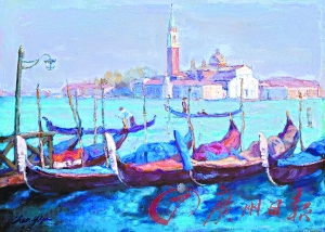 而陳逸飛的《威尼斯》以前從沒有拍賣過,是現(xiàn)在的擁有人1999年直接向畫家購買的。取景是威尼斯著名的大運(yùn)河 ,前面泊著4艘運(yùn)河木船 ,運(yùn)河上另有兩艘木船,對(duì)岸是著名的圣馬可大教堂。朦朧的煙霞,叫人分不清是早晨還是黃昏。采用的意象表達(dá)手法是陳逸飛作品中極為罕有的。早在1990年,畫家曾繪過一幅同名的風(fēng)景畫。然而兩幅畫有很大的不同。1990年那一幅層次較分明,色彩也較濃烈,采用的是陳逸飛一貫的寫實(shí)手法。9年后的《威尼斯》用色較淡,景物的處理較隨意,很有印象派大師莫奈的影子。