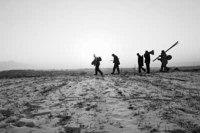 王水龍戲班外出演戲,走在空曠的雪地上,他們的身影有些孤獨。