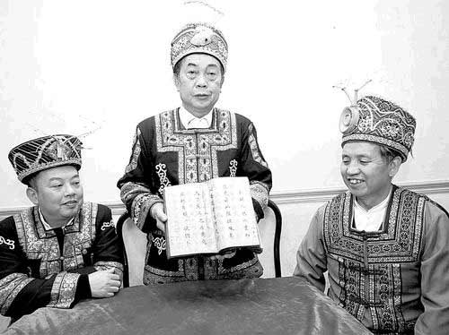 1月3日,貴州省仡佬學(xué)會(huì)副會(huì)長付爾光(中)在遵義向記者展示新近發(fā)現(xiàn)的漢字對(duì)照仡佬文《九天大濮史錄》。這本仡佬文用朱砂書寫、漢文為黑墨對(duì)照,記述仡佬族人發(fā)展歷史的書,據(jù)說就是傳說中的仡佬族天書。該書的發(fā)現(xiàn)結(jié)束了仡佬族只有語言而無文字的說法。