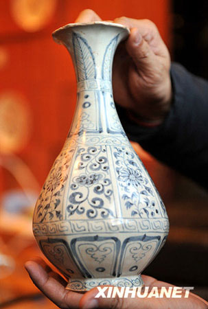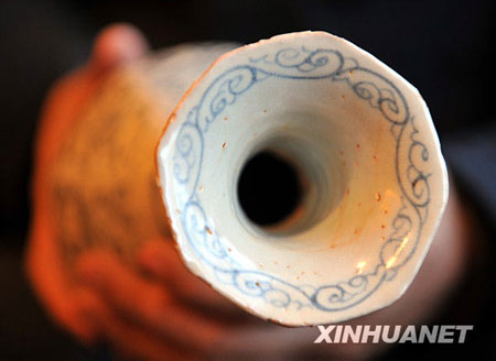 元代青花八方玉壺春瓶造型曲線優(yōu)美、繪畫(huà)線條流暢自如,陶瓷考古專(zhuān)家認(rèn)為代表了當(dāng)年高超的制瓷工藝和繪畫(huà)水準(zhǔn)。新華社記者 章武攝