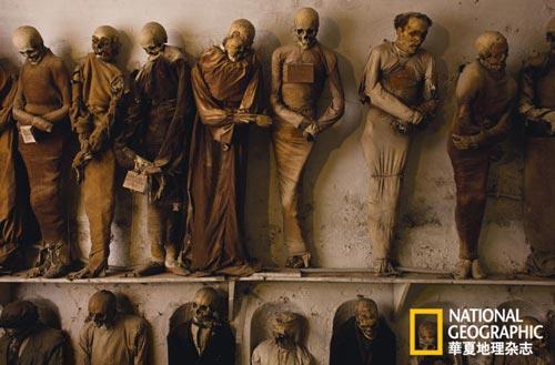 在歐洲,對(duì)尸體進(jìn)行干燥處理和保存算是西西里島的獨(dú)門絕活。意大利其他地區(qū)也有此類現(xiàn)象,但絕大部分還是在西西里,這里的生者與死者之間有著更為緊密的聯(lián)系。有些神父對(duì)這種保存尸體寄托哀思的方式心懷不安,把其中一些從地下墓穴里運(yùn)出掩埋到墓地里。沒人知道埋了多少,也沒人知道這種干尸究竟有多少具。這讓人不免疑惑:為什么會(huì)有人這么做?把腐化的尸體拿來展覽用意何在?
