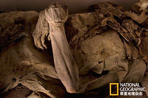 走下一截樓梯,經(jīng)過一座木雕圣母像,就來到了地下墓穴門口。房間驚人地寬敞,屋頂很高,呈拱形,一條條長(zhǎng)廊互成直角延伸開去。屋內(nèi)空氣涼爽潮濕,有股又酸又嗆的味道,來自塵土和腐爛的布料。窗口開得很高,把陽光漫射成縷縷蒼白的亮色,熒光燈噼啪閃爍,更是給這里蒙上了一層太平間般的陰森色彩。將近2000名死者就安歇在這里,或掛在墻上,或擺在椅子上,或躺在陳舊的棺木里。他們穿著生前最好的服裝,標(biāo)示出在人世從事的行當(dāng)。除了我,這里空無一人。