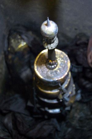 據(jù)負責“七寶阿育王塔”從鐵函中提出工作的南京晨光集團有限公司工藝研究所所長周明介紹,在提取寶塔工作之前,他們已經(jīng)通過X光檢測到里面有一個類似“金棺銀槨”的陰影,“這里面很有可能就是石碑上所記載的‘佛頂真骨’,但我個人覺得現(xiàn)在將這個‘金棺銀槨’打開的可能性極小。”周明告訴早報記者,自寶塔被取出后,就被安放在由博物館專門定做的一個與寶塔尺寸高度相同,且是恒溫恒濕的鋁合金容器中,南京市博物館的考古人員仍在對寶塔進行修復。