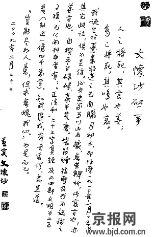 昨天(21日)傍晚,文懷沙家屬向本報提供了文懷沙啟事、文懷沙之子文斯以及友人趙缺先生的三篇文章,回應(yīng)李輝質(zhì)疑。本報來函照登,以饗讀者!幷