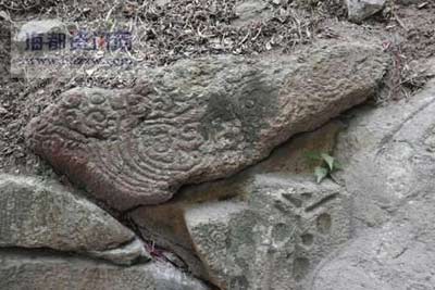 記者在九曲山瑞跡寺后的山崖找到了讀者所說的神秘巖畫。這是一處幾近垂直的巖壁,壁上人工雕刻的痕跡已被風(fēng)雨侵蝕得有些模糊,有兩處圖案相對清晰,一處的圖案如孔雀開屏,一條條直線呈放射狀散開。另一處則由幾塊巖畫組成,最上方一塊半米多高、一米多寬的石塊上,刻著一朵朵云狀花紋。下面則刻著一個幾何圖,像是一個舉起雙手的人,周圍有好幾個圈。