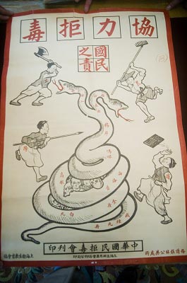 在檔案館此次展示的檔案中,有四張招貼畫十分引人注目,在其中的一張招貼畫上,一個(gè)孩子被各種毒品團(tuán)團(tuán)綁住,動(dòng)彈不得,周圍則是一些運(yùn)送、販賣毒品的場(chǎng)景,“這個(gè)孩子,指的其實(shí)是當(dāng)時(shí)的中國(guó)!边@四張招貼畫曾在1927年被張貼于上海的大街小巷,“在萬(wàn)國(guó)禁煙會(huì)之前,上海民間的禁毒行動(dòng)就一直存在,之后,更加是引起了一股禁毒的思潮。坐落于圓明園路的中華國(guó)民拒毒會(huì)就是一個(gè)典型的民間組織,雖然成立于1920年代,但和這股思潮是分不開的!毙辖ㄩ沤榻B,當(dāng)時(shí)的拒毒會(huì)除了張貼招貼畫、舉辦各種公益的講座之外,還曾經(jīng)組織運(yùn)動(dòng)會(huì),用健身的理念來(lái)抗拒毒品的誘惑。