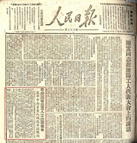 4.1949年2月28日,《人民日?qǐng)?bào)》關(guān)于李濟(jì)深等民主人士由沈陽(yáng)抵達(dá)北平的報(bào)道