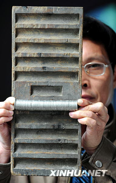 據(jù)介紹,這塊清代使用的“點鈔機(jī)”狀似算盤,長37厘米,寬16厘米,內(nèi)刻有11條凹槽,直徑同當(dāng)時流通的銅幣直徑吻合,其中10條長凹槽可一次性勘驗1000枚銅幣,中部的一條短凹槽可勘驗50枚銅幣。新華社記者彭張青攝
