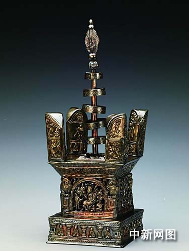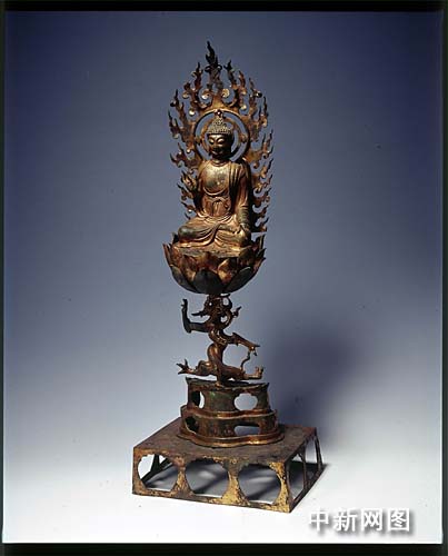 據(jù)浙江省博物館工作人員介紹,安放在雷峰塔天宮內(nèi)的“五代鎏金純銀阿育王塔”,及其塔內(nèi)供奉舍利的金瓶,在雷峰塔倒塌時(shí),此塔被嚴(yán)重壓扁,2008年底成功修復(fù),因此這次赴臺(tái)是在臺(tái)灣的首次亮相。而“唐五代鎏金銅釋迦牟尼佛說(shuō)法像”造型精美,釋迦牟尼佛結(jié)跏趺坐于盤龍托舉的蓮座上,身后是鏤空火焰紋大背光,靜謐的佛、張揚(yáng)的龍、升騰的烈焰,三者的精妙組合成就了一件藝術(shù)佳作。