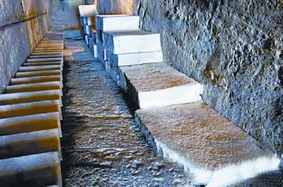 一切完畢后,施以偽裝,外人不知其詐。若有盜墓者進得門來,踏中蹺板條,外力作用迫使繃緊的索鏈某處掛鉤脫落,如同打井的轱轆突然放松,懸空的巨石疾速落下,將躲閃不及的盜墓者拍成肉餅。因蹺板呈細窄的長條狀,只有被踏后才能導(dǎo)致懸石落地,而相鄰的其他蹺板則安然無恙,仍靜靜地伏在原處等待下一伙盜墓者的進入。一旦盜賊的腳步踏上,與之相連的懸石相繼落下,再次對膽大妄為者給予致命一擊。如此往復(fù),直至三層懸石盡墜于地,殺傷數(shù)人為止。