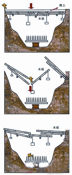 所謂連環(huán)翻板,即在墓道中挖掘深約3米以上的陷坑,長短與寬度視墓道具體情形而定,坑下分布約10厘米左右的刀錐利器?由蠈悠礁矓(shù)塊木板,木板中間有軸,下綴一小型相同重量的物體,呈天平秤狀,板上有掩蓋物。若盜墓者踏上木板,板的一端隨之下陷,人必掉到坑內(nèi)的刀錐之上。
