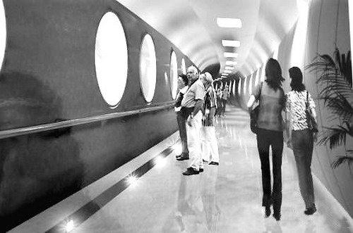 水下博物館在水下40米處,環(huán)境極為特殊。要進(jìn)入水下博物館,必須要經(jīng)過一個(gè)和乘飛機(jī)類似的安檢程序。之后踏上一條長88米的電梯,進(jìn)入水深40米處。再通過一條約150米的平直交通走廊,在邁過一道寬約一米、厚約半米的鋼制艙門后,進(jìn)入到60多米長的環(huán)形參觀走廊。