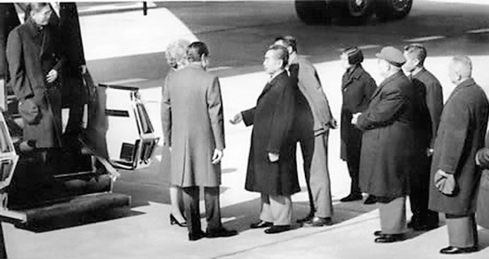 專機于上午11時30分抵達北京東郊首都機場。尼克松總統(tǒng)與其夫人并排手挽手頂著寒風,穩(wěn)步踏上專機舷梯。然后尼克松總統(tǒng)搶先一步走下舷梯,主動伸出右手,周總理小步上前,也伸出手來,兩只手熱烈有力地緊握在一起。美國國務卿杜勒斯在1954年日內(nèi)瓦會議期間拒絕與中國總理周恩來握手的時代,終于過去了。