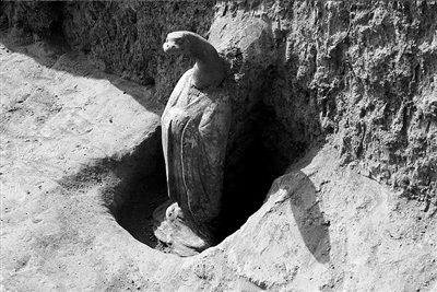 根據(jù)目前的考古資料,兩京(長安、洛陽)地區(qū)唐墓中所見最早、最完整的一組十二生肖俑出土于西安南郊開元二十四年(736年)唐兵部常選孫承嗣和夫人高氏合葬墓,俑高約25厘米。十二生肖俑在初唐晚期和盛唐時代墓葬中時有發(fā)現(xiàn),但在墓葬圍溝中出土卻極為稀見,這可能代表著更高級別的一種喪葬制度?脊艑<艺J為,西安咸陽機場考古工地這次發(fā)現(xiàn)的十二生肖俑群組合基本完整,體量巨大,造型優(yōu)美,出土位置明確,是一組研究唐代喪葬制度和雕塑藝術(shù)不可多得的珍貴資料。