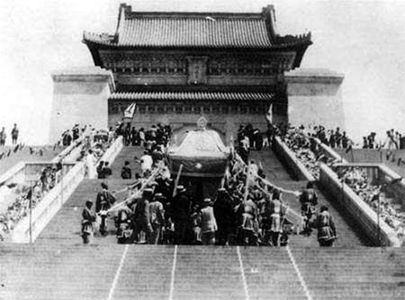 上午8時(shí),各行列先后到達(dá)紫金山麓,由糾察員引導(dǎo)至指定地點(diǎn)肅立恭候。奉安籌備人員也將靈輿安置于石級(jí)前廣場(chǎng)上守候。靈輿為亭子式,用藍(lán)綢裹扎,四周懸白綢彩球。杠夫108人分別肅立在靈輿兩側(cè)等候。9時(shí)05分,巨幅遺像到達(dá)廣場(chǎng),遺像前有“肅立”、“致敬”旗兩面,全體參加人員即脫帽肅立致敬。不久,各國(guó)專使、外賓也列隊(duì)到達(dá),登上第一層石級(jí)平臺(tái)恭候。9時(shí)20分靈車緩緩開到廣場(chǎng),停在靈輿前。家屬下車,進(jìn)黑色布幔中肅立于靈櫬之側(cè)。國(guó)民黨中央委員、國(guó)民政府委員等送櫬人員由總指揮朱培德、總干事孔祥熙指揮,各按規(guī)定地點(diǎn)肅立。9時(shí)30分,由孔祥熙、吳鐵城、鄭洪年等率領(lǐng)杠夫10人將靈櫬從靈車上降下,移上弼輿。9時(shí)45分起杠,踏石級(jí)而上,40名樂(lè)手奏哀樂(lè)前導(dǎo),宋慶齡率領(lǐng)眾親屬等女眷在布幔內(nèi)步行送殯,執(zhí)紼人員在兩側(cè)恭扶前進(jìn)。10時(shí)08分,靈輿抵達(dá)祭堂前平臺(tái),杠夫換用小杠抬靈櫬,宣贊員宣贊,執(zhí)紼人員恭扶靈櫬入靈堂,停于祭堂中央,肅靜片刻后,由宣贊員宣贊,舉行奉安典禮。奏哀樂(lè)后,全體行三鞠躬禮,然后獻(xiàn)花圈,讀誄文,蔣介石主祭,譚延闿、胡漢民、王寵惠、戴季陶、蔡元培陪祭。典禮完畢后,孔祥熙率領(lǐng)杠夫?qū)㈧`櫬移入墓室,孫中山親屬、國(guó)民黨中央代表蔣介石、故舊代表犬養(yǎng)毅、各國(guó)專使代表歐登科(荷蘭專使)隨同進(jìn)入墓室,率領(lǐng)杠夫?qū)O中山靈櫬奉安于壙?jī)?nèi),靈穴上置捷克雕塑家高琪所刻孫中山先生漢白玉臥像。這時(shí),獅子山炮臺(tái)響起一百零一響禮炮,全國(guó)民眾停止工作,默哀3分鐘,12時(shí)正,奉安完畢。在祭堂內(nèi)參加大典的人員依次進(jìn)墓門瞻仰。然后回到祭堂,全體集合,再行鞠躬禮,奏哀樂(lè)。最后,由夫人宋慶齡率領(lǐng)孫科夫婦、戴恩賽(孫中山女婿)夫婦等將墓門關(guān)閉,備極隆重的奉安大典告成。當(dāng)日,于陵下矗立一塊巨牌,上刻譚延闿所書“民國(guó)十八年六月一日,中國(guó)國(guó)民黨葬總理孫先生于此”。