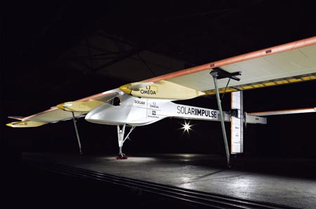 6 月26 日,伯特蘭·皮卡特在瑞士的蘇黎世機場,向人們展示了這架依靠太陽能作為全部動力的飛機。這架飛機看上過去纖巧、修長,機翼和尾翼上都蒙覆了一層薄膜一般的太陽能電池板。這些電池板將把陽光轉(zhuǎn)化為電能,不僅能讓飛機在白天持續(xù)飛行,在夜間,被電池板儲存下來的能量也能支持飛機繼續(xù)它的行程。