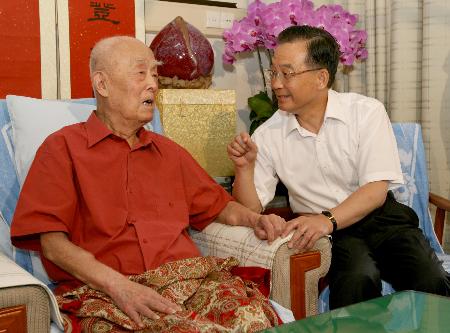 中新網(wǎng)7月11日電 據(jù)中國(guó)政府網(wǎng)消息:“季老,我看您來了!2006年8月6日上午9時(shí),中共中央政治局常委、國(guó)務(wù)院總理溫家寶一走進(jìn)解放軍總醫(yī)院病房,就緊緊握住季羨林先生的手說:“今天是您95歲生日,我向您表示祝賀!