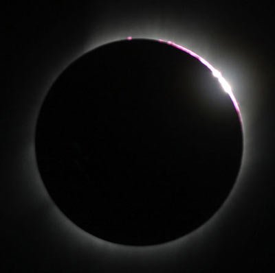 月亮繼續(xù)往東移動(dòng),當(dāng)月面的西邊緣和日面的西邊緣相內(nèi)切的瞬間,稱為生光,它是日全食結(jié)束的時(shí)刻。在生光發(fā)生之前,鉆石環(huán)、貝利珠的現(xiàn)象會(huì)出現(xiàn)在太陽(yáng)的西邊緣,但很快就會(huì)消失。接著在太陽(yáng)西邊緣又射出一線刺眼的光芒,在日全食時(shí)可以看到的色球?qū)、日珥、日冕等現(xiàn)象迅即隱沒(méi)在陽(yáng)光之中,星星也消失了,陽(yáng)光重新普照大地。