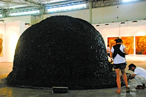 藝術(shù)家原弓將大卡車直接拉進了展廳正中最醒目的位置,一開場就讓觀眾將視角對準(zhǔn)了汶川地震。熊貓人趙半狄也來湊了個熱鬧,展出了其2008年給災(zāi)區(qū)孩子送彩色熊貓的紀(jì)實圖片。2009年圓明園鼠兔獸事件讓傅文俊的作品對準(zhǔn)圓明園十二生肖獸首。