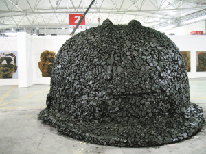 現(xiàn)場(chǎng)最扯眼球的作品是藝術(shù)家張建華的雕塑作品《礦工帽》。張建華說(shuō),這個(gè)礦工帽用了3噸煤塊貼滿,更像一座孤墳,他希望以此反映農(nóng)民工在社會(huì)發(fā)展過(guò)程中付出的沉重代價(jià)。